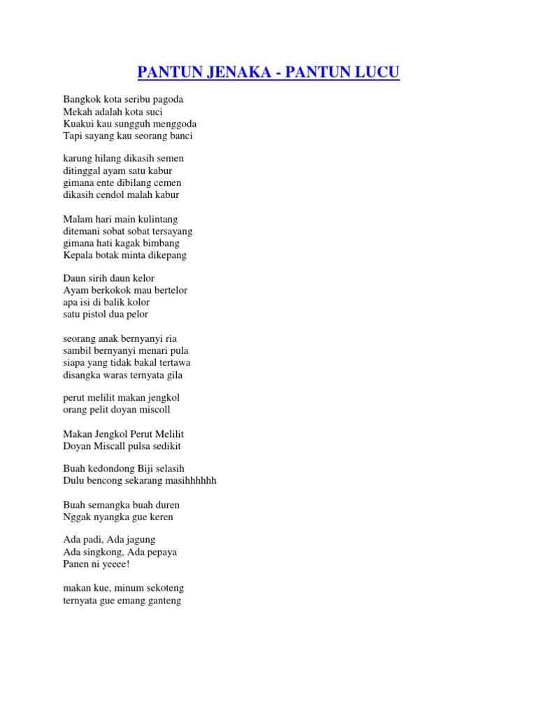 Umumnya pantun yang dibawakan adalah pantun jenaka atau pantun lucu yang bertujuan membuat orang tertawa. Wanita hamil dilarang baca pantun gokil ini ikan hiu makan badak i love u mendadak ikan paus makan pecel i miss u girl Buah jeruk buah kedondong. Pelbagai lauk pauk dan kuih muih tak ketinggalan buah buahan Kerana banyak buah buahan teringin pula saya hendak mengarang pantun berasaskan buah buahan.